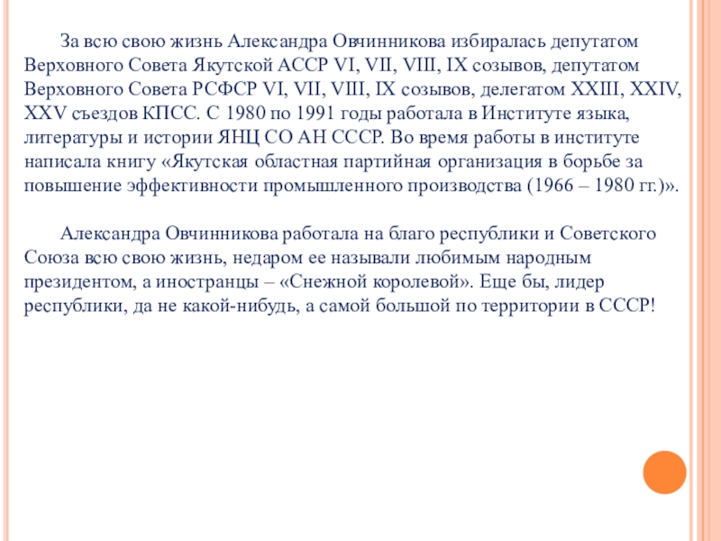 Слайд 9 За всю свою жизнь Александра Овчинникова избиралась депутатом Верховного Совета Якутской