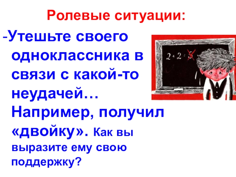 Ролевые ситуации:-Утешьте своего одноклассника в связи с какой-то неудачей… Например, получил «двойку». Как вы выразите ему свою