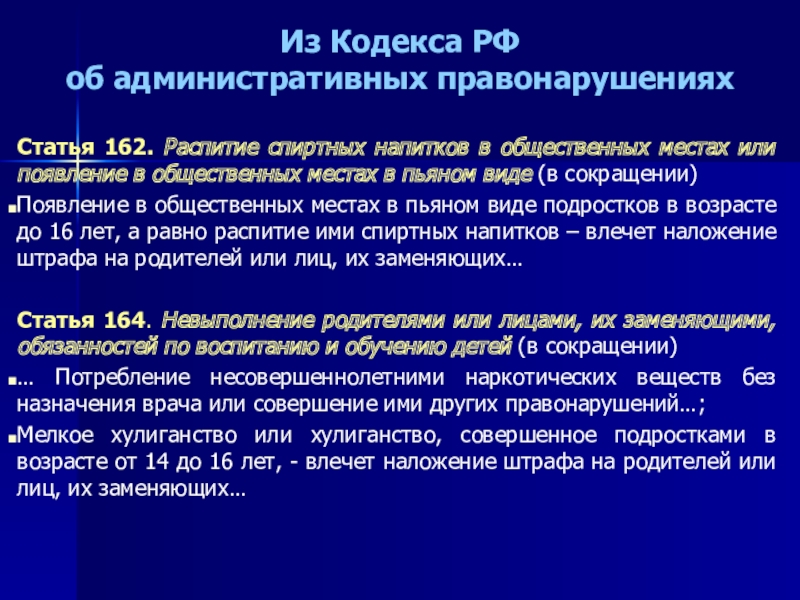 Появление в общественных местах в пьяном виде подростков в возрасте до 16 лет, а равно распитие ими спиртных напитков – влечет наложение штрафа на родителей или лиц, их заменяющих…