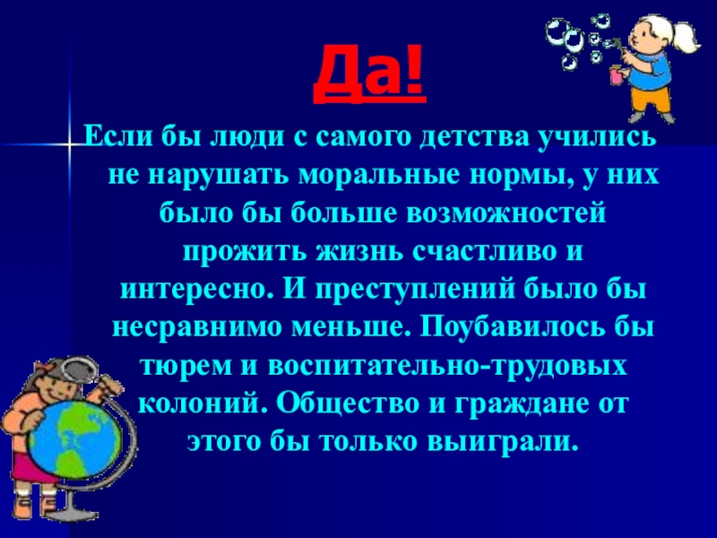 нормы, у них было бы больше возможностей прожить жизнь счастливо и интересно. И преступлений было бы несравнимо меньше. Поубавилось бы тюрем и воспитательно-трудовых колоний. Общество и граждане от этого бы только выиграли.