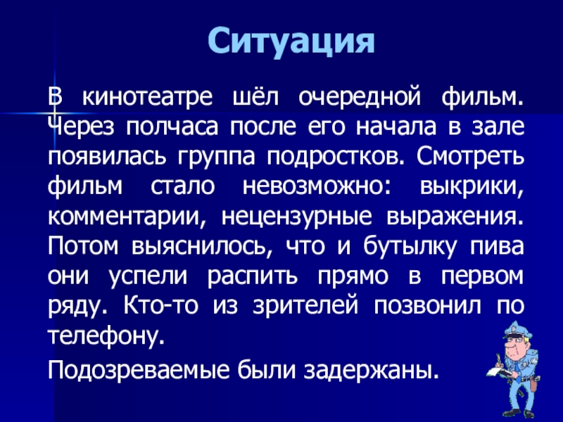в зале появилась группа подростков. Смотреть фильм стало невозможно: выкрики, комментарии, нецензурные выражения. Потом выяснилось, что и бутылку пива они успели распить прямо в первом ряду. Кто-то из зрителей позвонил по телефону.