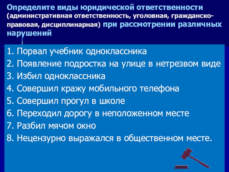 Слайд 24Определите виды юридической ответственности (административная ответственность, уголовная, гражданско-правовая, дисциплинарная) при рассмотрении