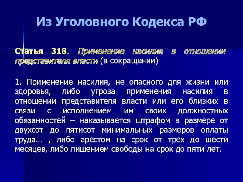 1. Применение насилия, не опасного для жизни или здоровья, либо угроза применения насилия в отношении представителя власти или его близких в связи с исполнением им своих должностных обязанностей – наказывается штрафом в размере от двухсот до пятисот минимальных размеров оплаты труда… , либо арестом на срок от трех до шести месяцев, либо лишением свободы на срок до пяти лет.