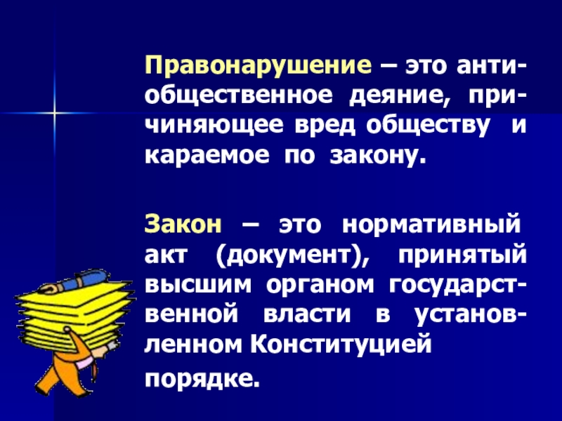 Правонарушение – это анти-общественное деяние, при-чиняющее вред обществу и караемое по