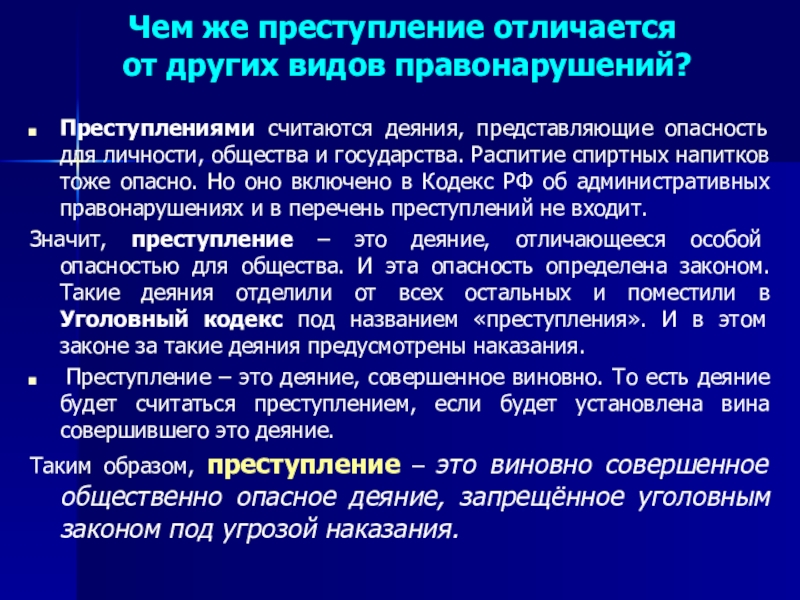 опасность для личности, общества и государства. Распитие спиртных напитков тоже опасно. Но оно включено в Кодекс РФ об административных правонарушениях и в перечень преступлений не входит.