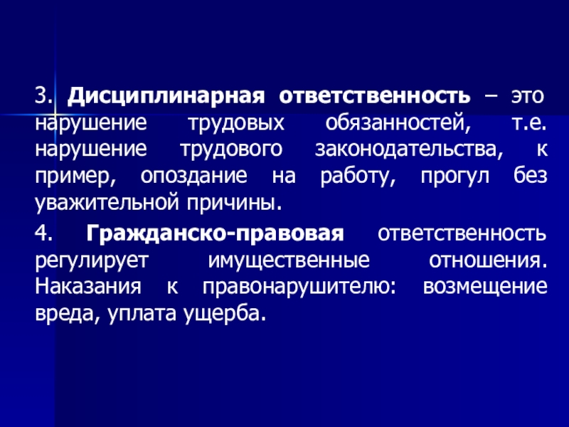 3. Дисциплинарная ответственность – это нарушение трудовых обязанностей, т.е. нарушение трудового