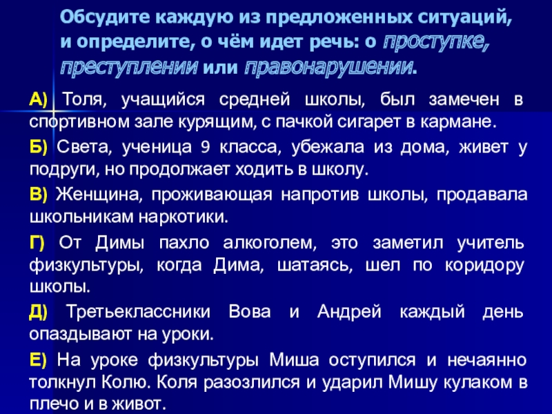 Е) На уроке физкультуры Миша оступился и нечаянно толкнул Колю. Коля разозлился и ударил Мишу кулаком в плечо и в живот.