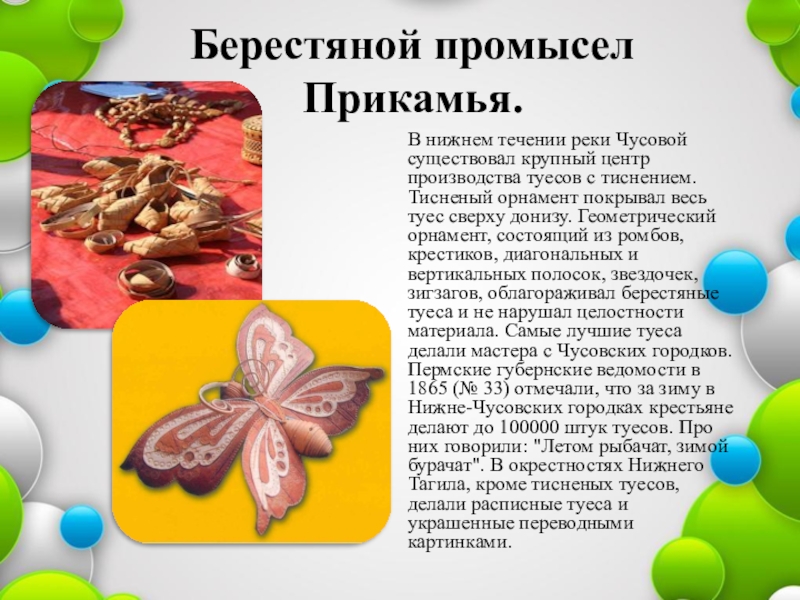 туесов с тиснением. Тисненый орнамент покрывал весь туес сверху донизу. Геометрический орнамент, состоящий из ромбов, крестиков, диагональных и вертикальных полосок, звездочек, зигзагов, облагораживал берестяные туеса и не нарушал целостности материала. Самые лучшие туеса делали мастера с Чусовских городков. Пермские губернские ведомости в 1865 (№ 33) отмечали, что за зиму в Нижне-Чусовских городках крестьяне делают до 100000 штук туесов. Про них говорили: "Летом рыбачат, зимой бурачат". В окрестностях Нижнего Тагила, кроме тисненых туесов, делали расписные туеса и украшенные переводными картинками.