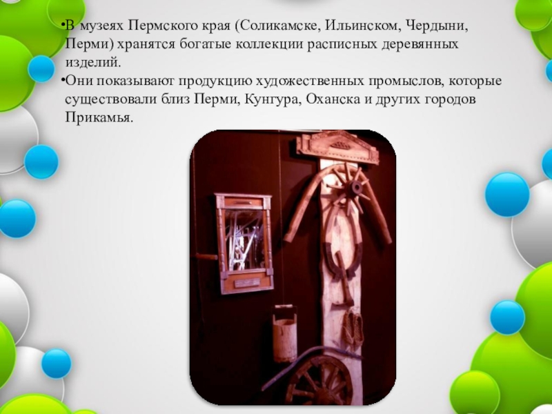Они показывают продукцию художественных промыслов, которые существовали близ Перми, Кунгура, Оханска и других городов Прикамья.