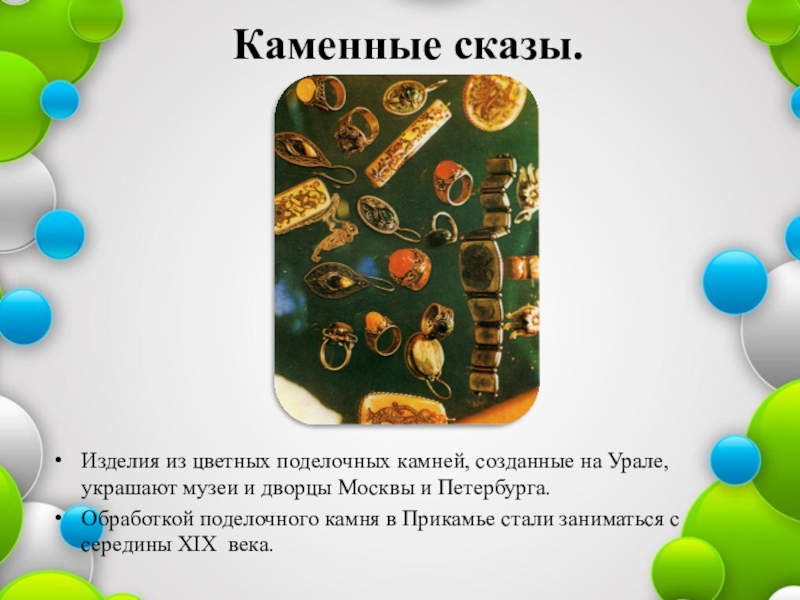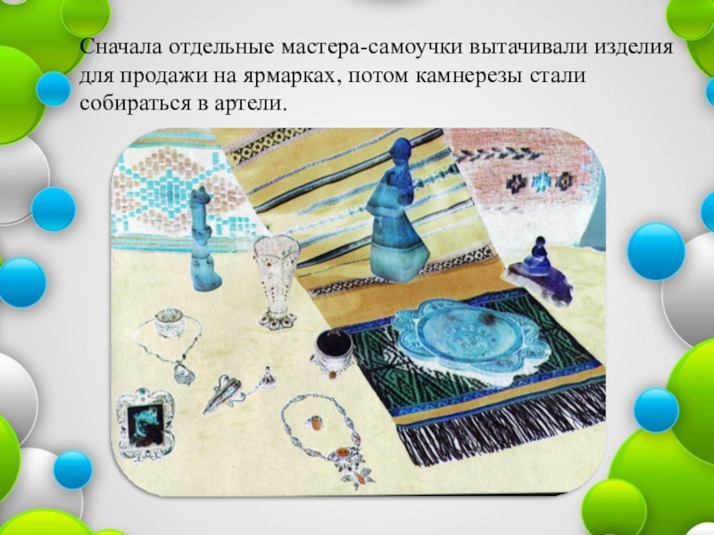 Слайд 13Сначала отдельные мастера-самоучки вытачивали изделия для продажи на ярмарках, потом камнерезы