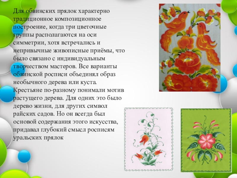 Слайд 7Для обвинских прялок характерно традиционное композиционное построение, когда три цветочные группы
