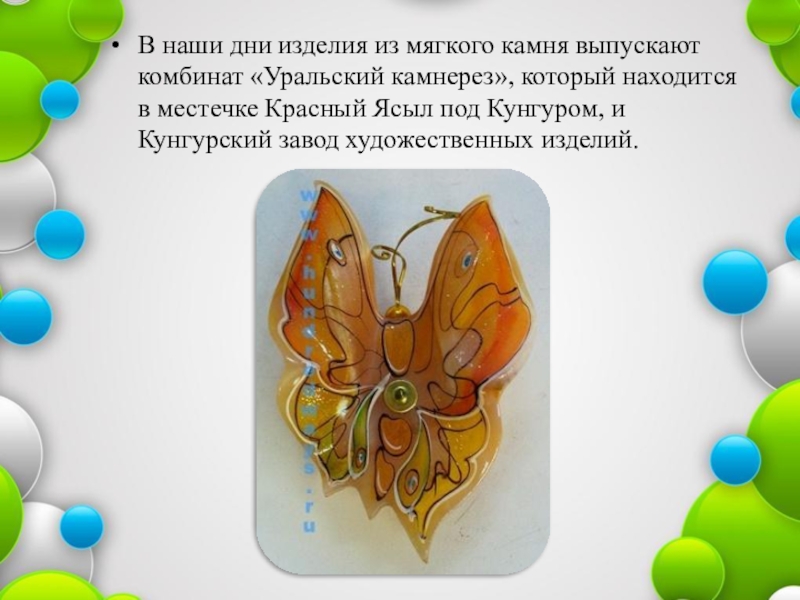 Слайд 14В наши дни изделия из мягкого камня выпускают комбинат «Уральский камнерез»,