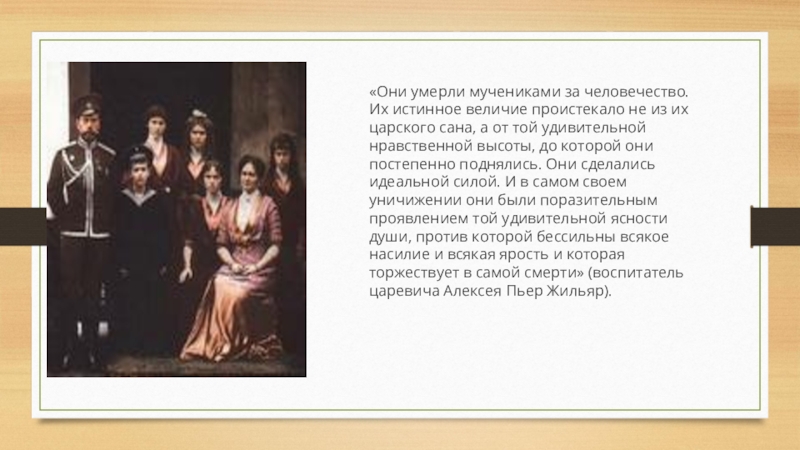 их царского сана, а от той удивительной нравственной высоты, до которой они постепенно поднялись. Они сделались идеальной силой. И в самом своем уничижении они были поразительным проявлением той удивительной ясности души, против которой бессильны всякое насилие и всякая ярость и которая торжествует в самой смерти» (воспитатель царевича Алексея Пьер Жильяр).