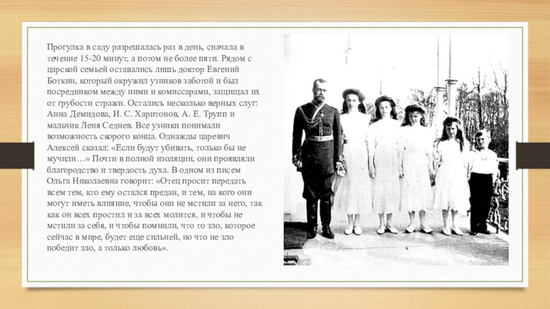 минут, а потом не более пяти. Рядом с царской семьей оставались лишь доктор Евгений Боткин, который окружил узников заботой и был посредником между ними и комиссарами, защищал их от грубости стражи. Остались несколько верных слуг: Анна Демидова, И. С. Харитонов, А. Е. Трупп и мальчик Леня Седнев. Все узники понимали возможность скорого конца. Однажды царевич Алексей сказал: «Если будут убивать, только бы не мучили…» Почти в полной изоляции, они проявляли благородство и твердость духа. В одном из писем Ольга Николаевна говорит: «Отец просит передать всем тем, кто ему остался предан, и тем, на кого они могут иметь влияние, чтобы они не мстили за него, так как он всех простил и за всех молится, и чтобы не мстили за себя, и чтобы помнили, что то зло, которое сейчас в мире, будет еще сильней, но что не зло победит зло, а только любовь».