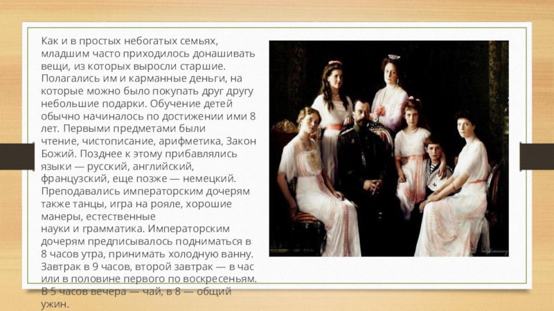 из которых выросли старшие. Полагались им и карманные деньги, на которые можно было покупать друг другу небольшие подарки. Обучение детей обычно начиналось по достижении ими 8 лет. Первыми предметами были чтение, чистописание, арифметика, Закон Божий. Позднее к этому прибавлялись языки — русский, английский, французский, еще позже — немецкий. Преподавались императорским дочерям также танцы, игра на рояле, хорошие манеры, естественные науки и грамматика. Императорским дочерям предписывалось подниматься в 8 часов утра, принимать холодную ванну. Завтрак в 9 часов, второй завтрак — в час или в половине первого по воскресеньям. В 5 часов вечера — чай, в 8 — общий ужин.