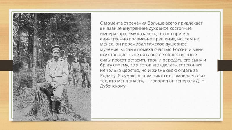 Слайд 16С момента отречения больше всего привлекает внимание внутреннее духовное состояние императора.