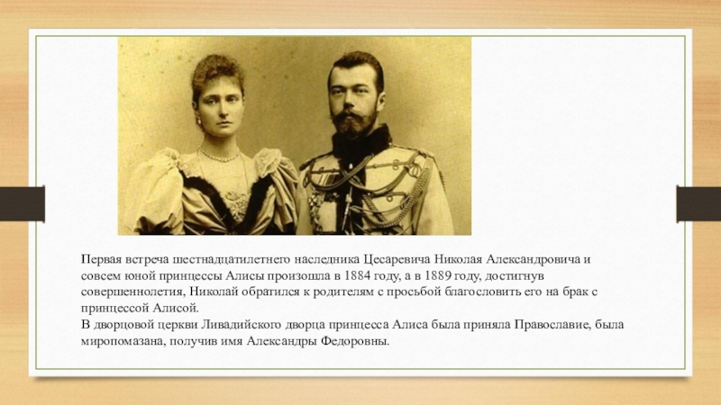 Слайд 6Первая встреча шестнадцатилетнего наследника Цесаревича Николая Александровича и совсем юной принцессы