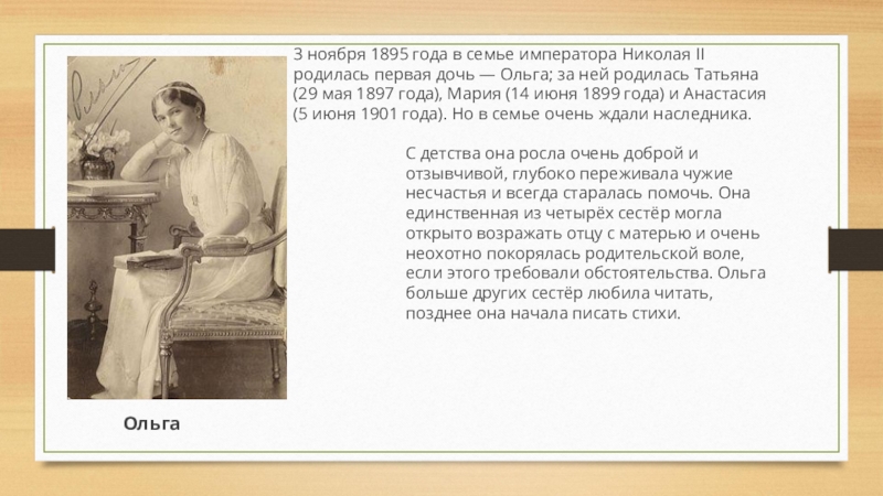 дочь — Ольга; за ней родилась Татьяна (29 мая 1897 года), Мария (14 июня 1899 года) и Анастасия (5 июня 1901 года). Но в семье очень ждали наследника.