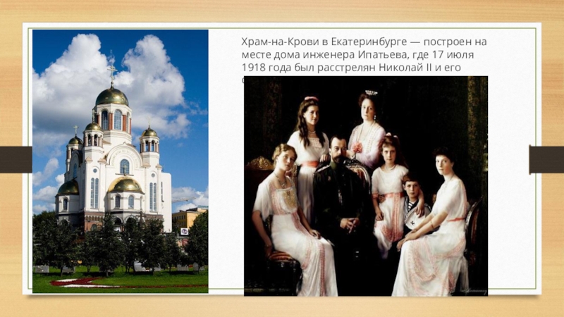 Слайд 23Храм-на-Крови в Екатеринбурге — построен на месте дома инженера Ипатьева, где