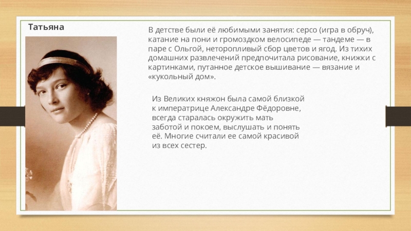 пони и громоздком велосипеде — тандеме — в паре с Ольгой, неторопливый сбор цветов и ягод. Из тихих домашних развлечений предпочитала рисование, книжки с картинками, путанное детское вышивание — вязание и «кукольный дом».