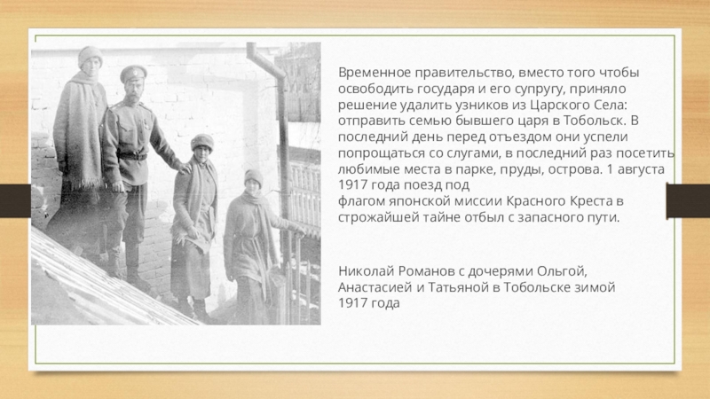 решение удалить узников из Царского Села: отправить семью бывшего царя в Тобольск. В последний день перед отъездом они успели попрощаться со слугами, в последний раз посетить любимые места в парке, пруды, острова. 1 августа 1917 года поезд под флагом японской миссии Красного Креста в строжайшей тайне отбыл с запасного пути.