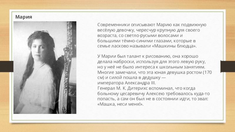 У Марии был талант к рисованию, она хорошо делала наброски, используя для этого левую руку, но у неё не было интереса к школьным занятиям. Многие замечали, что эта юная девушка ростом (170 см) и силой пошла в дедушку — императора Александра III. Генерал М. К. Дитерихс вспоминал, что когда больному цесаревичу Алексею требовалось куда-то попасть, а сам он был не в состоянии идти, то звал: «Машка, неси меня!».