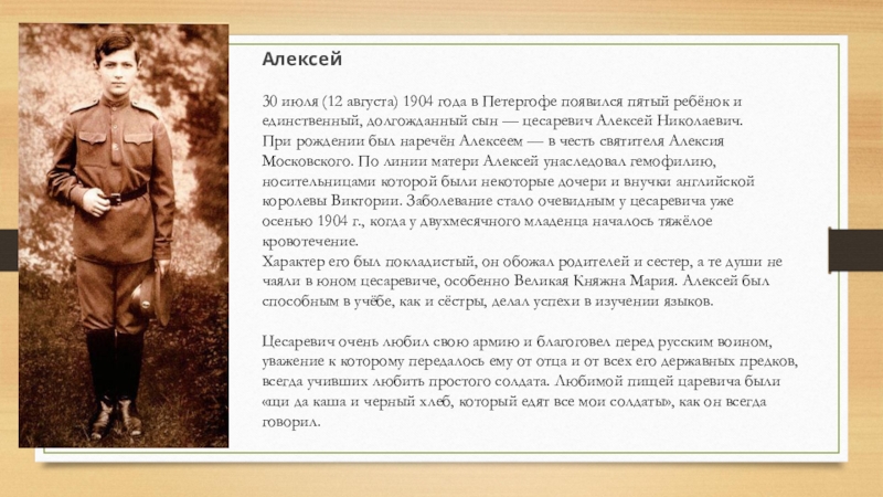 Характер его был покладистый, он обожал родителей и сестер, а те души не чаяли в юном цесаревиче, особенно Великая Княжна Мария. Алексей был способным в учёбе, как и сёстры, делал успехи в изучении языков.