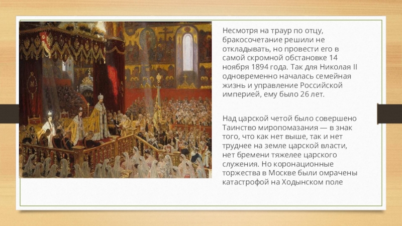 Над царской четой было совершено Таинство миропомазания — в знак того, что как нет выше, так и нет труднее на земле царской власти, нет бремени тяжелее царского служения. Но коронационные торжества в Москве были омрачены катастрофой на Ходынском поле