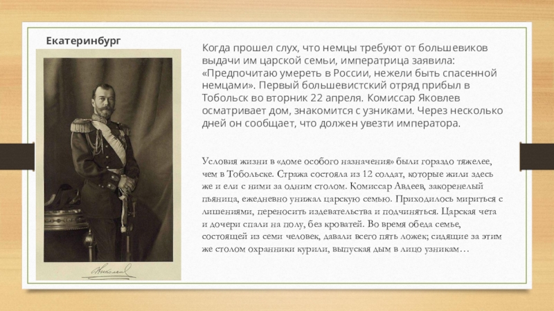 семьи, императрица заявила: «Предпочитаю умереть в России, нежели быть спасенной немцами». Первый большевистский отряд прибыл в Тобольск во вторник 22 апреля. Комиссар Яковлев осматривает дом, знакомится с узниками. Через несколько дней он сообщает, что должен увезти императора.