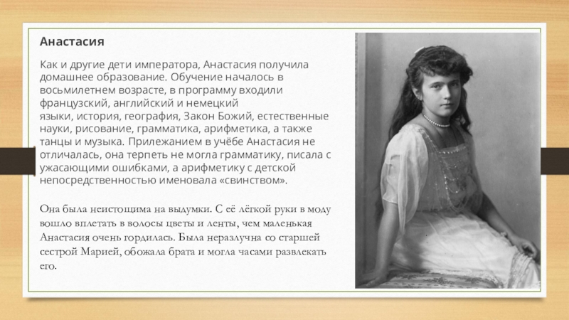 Как и другие дети императора, Анастасия получила домашнее образование. Обучение началось