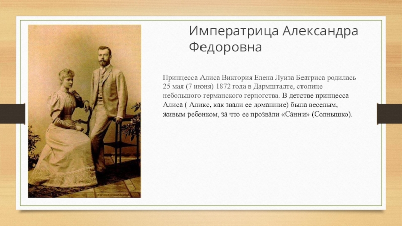 (7 июня) 1872 года в Дармштадте, столице небольшого германского герцогства. В детстве принцесса Алиса ( Аликc, как звали ее домашние) была веселым, живым ребенком, за что ее прозвали «Санни» (Солнышко).