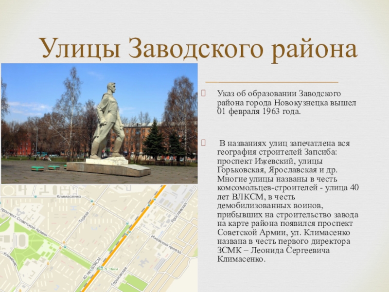 Улицы Заводского районаУказ об образовании Заводского района города Новокузнецка вышел 01 февраля 1963 года. В названиях улиц