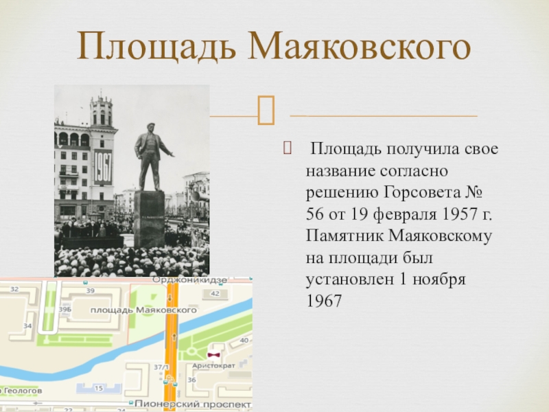 Площадь Маяковского Площадь получила свое название согласно решению Горсовета № 56 от 19 февраля 1957 г. Памятник