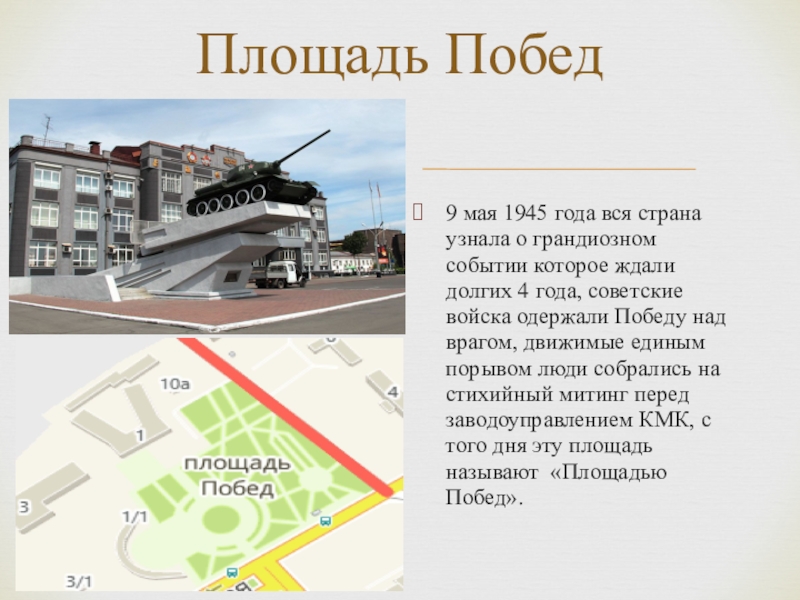 которое ждали долгих 4 года, советские войска одержали Победу над врагом, движимые единым порывом люди собрались на стихийный митинг перед заводоуправлением КМК, с того дня эту площадь называют «Площадью Побед».