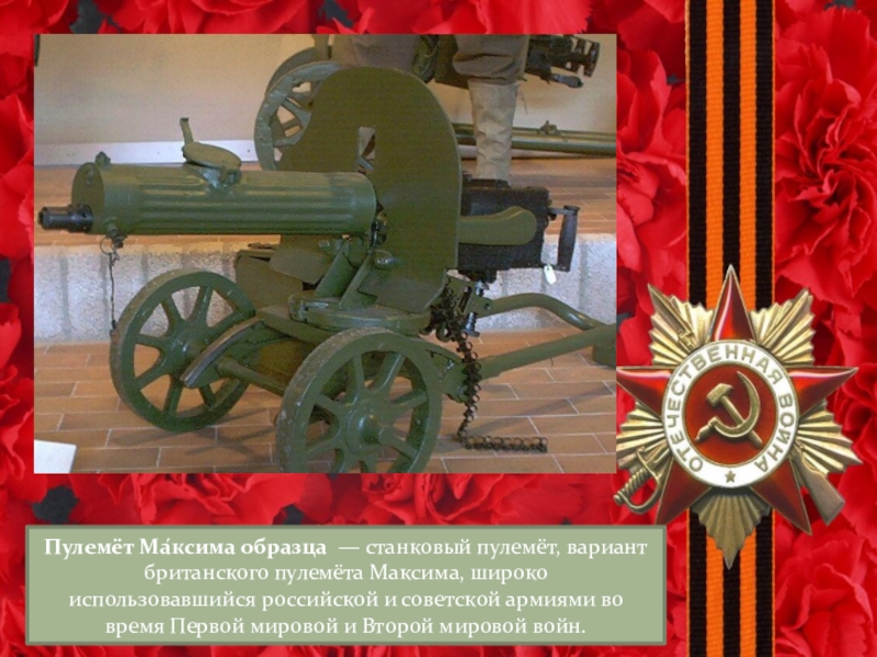 Слайд 5Пулемёт Ма́ксима образца  — станковый пулемёт, вариант британского пулемёта Максима, широко использовавшийся российской и советской армиями во