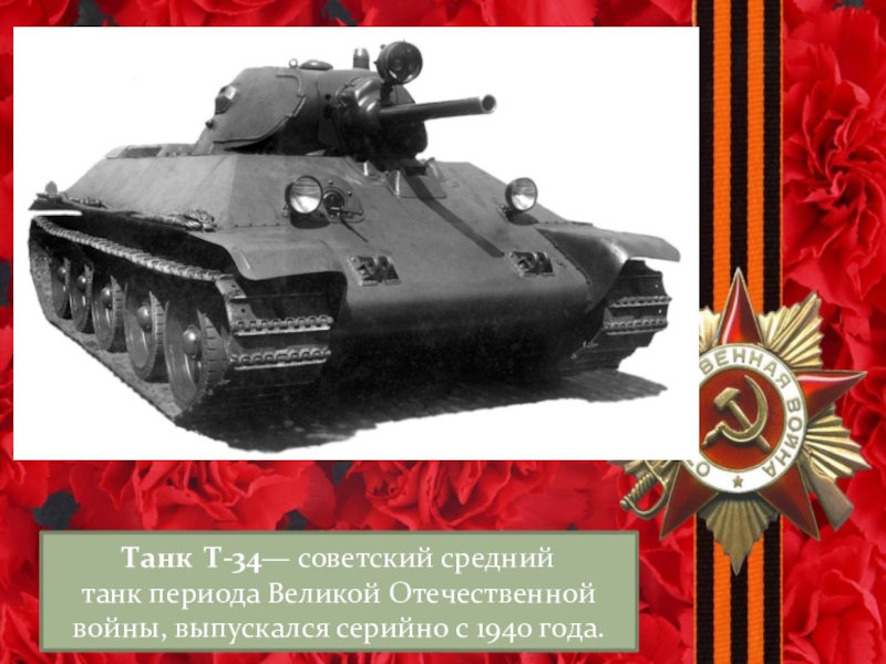 Слайд 2Танк Т-34— советский средний танк периода Великой Отечественной войны, выпускался серийно с 1940 года.
