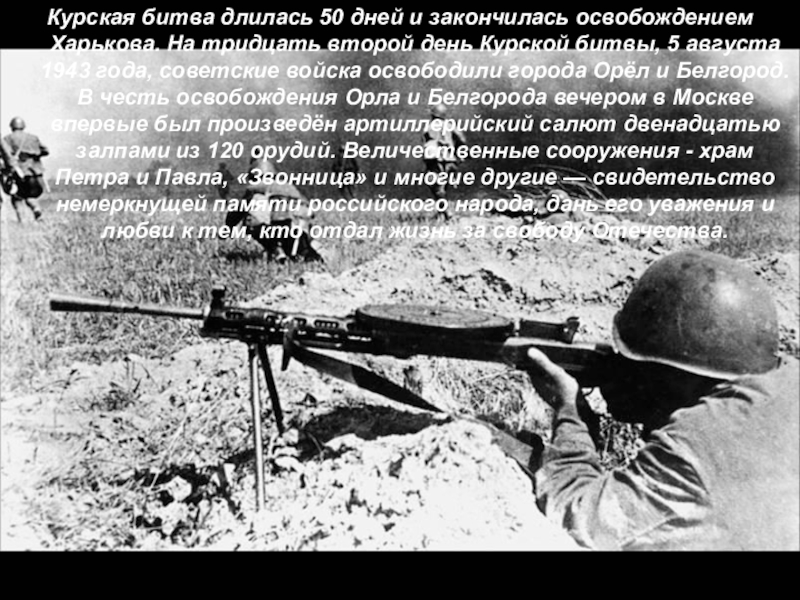 Слайд 10Курская битва длилась 50 дней и закончилась освобождением Харькова. На тридцать