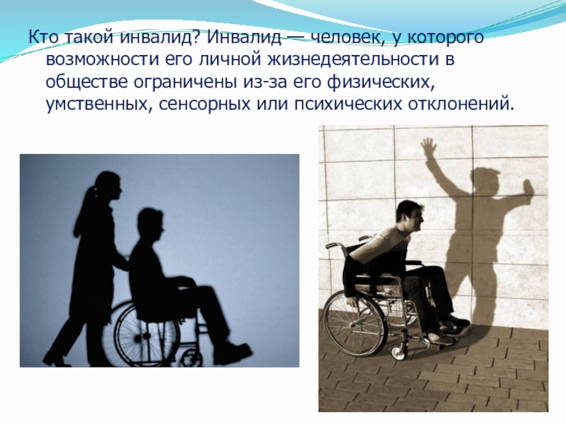 Слайд 3Кто такой инвалид? Инвалид — человек, у которого возможности его личной