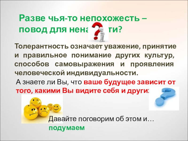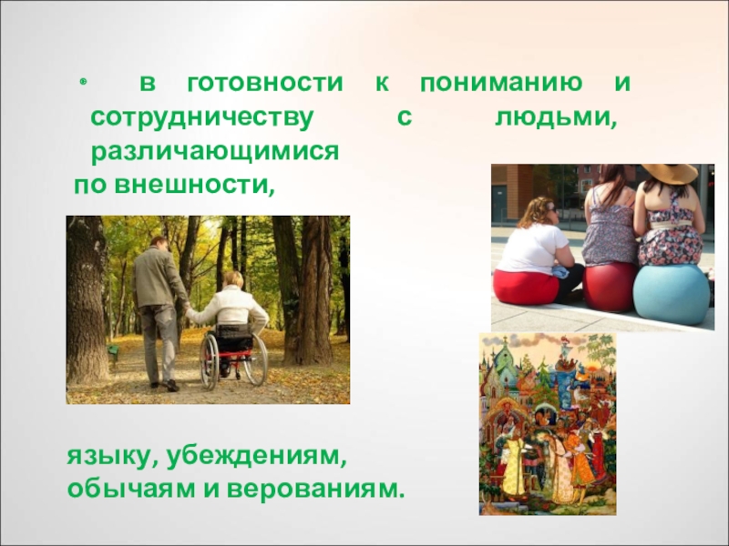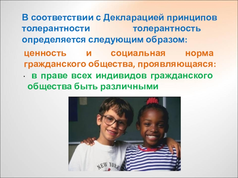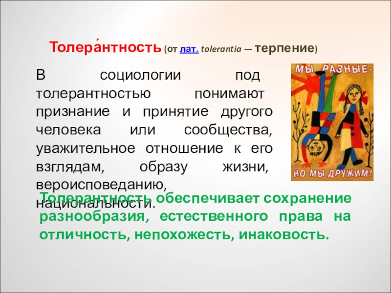 Толерантность обеспечивает сохранение разнообразия, естественного права на отличность, непохожесть, инаковость.