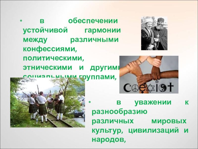в уважении к разнообразию различных мировых культур, цивилизаций и народов,