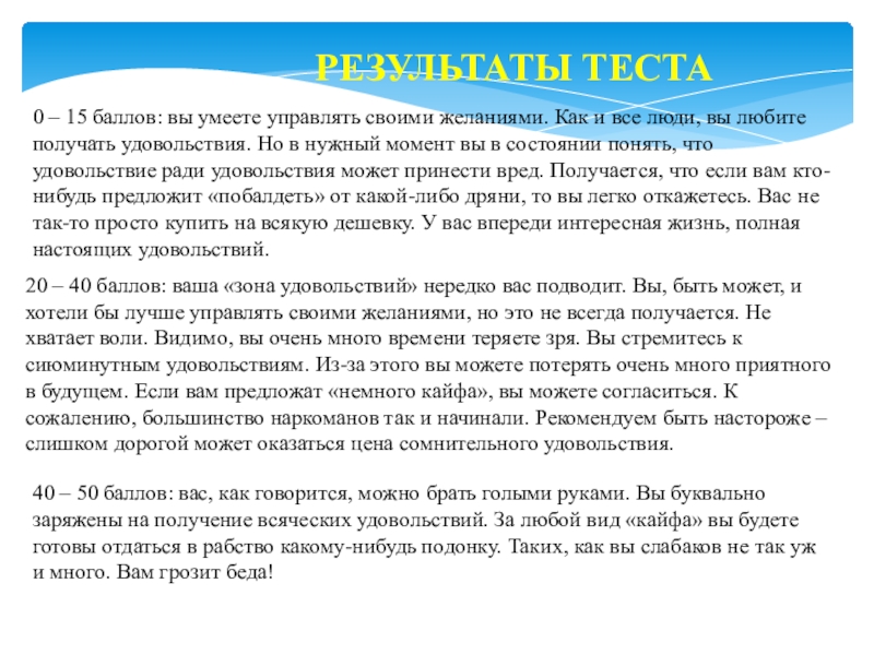 20 – 40 баллов: ваша «зона удовольствий» нередко вас подводит. Вы, быть может, и хотели бы лучше управлять своими желаниями, но это не всегда получается. Не хватает воли. Видимо, вы очень много времени теряете зря. Вы стремитесь к сиюминутным удовольствиям. Из-за этого вы можете потерять очень много приятного в будущем. Если вам предложат «немного кайфа», вы можете согласиться. К сожалению, большинство наркоманов так и начинали. Рекомендуем быть настороже – слишком дорогой может оказаться цена сомнительного удовольствия.