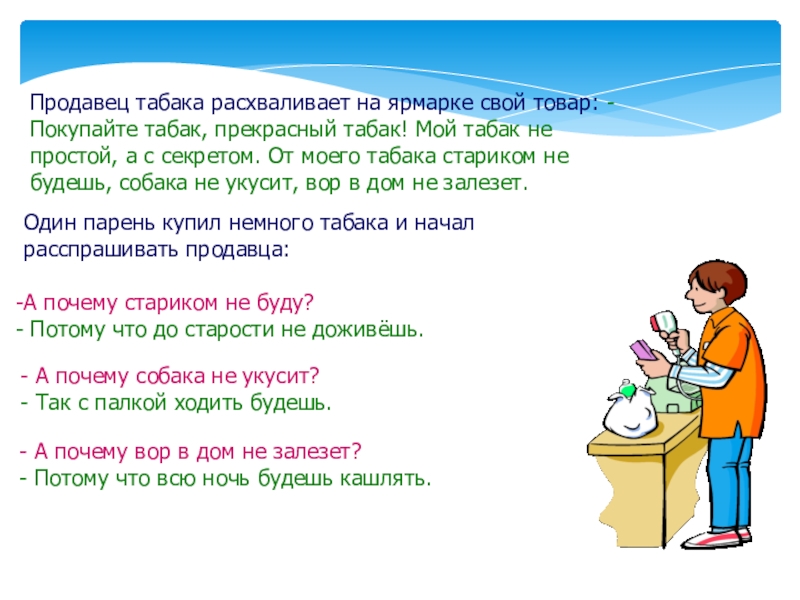 Продавец табака расхваливает на ярмарке свой товар: - Покупайте табак, прекрасный табак! Мой табак не простой, а с секретом. От моего табака стариком не будешь, собака не укусит, вор в дом не залезет.