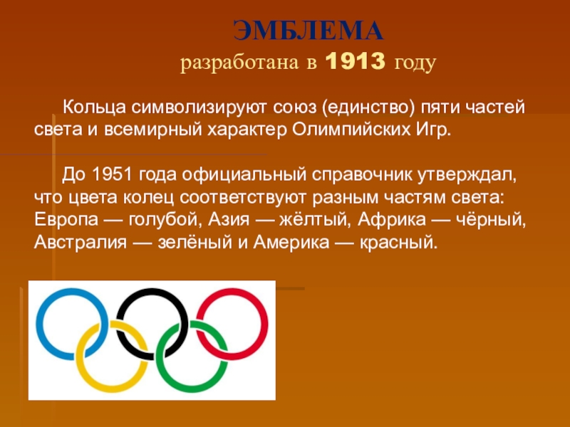 До 1951 года официальный справочник утверждал, что цвета колец соответствуют разным частям света: Европа — голубой, Азия — жёлтый, Африка — чёрный, Австралия — зелёный и Америка — красный.