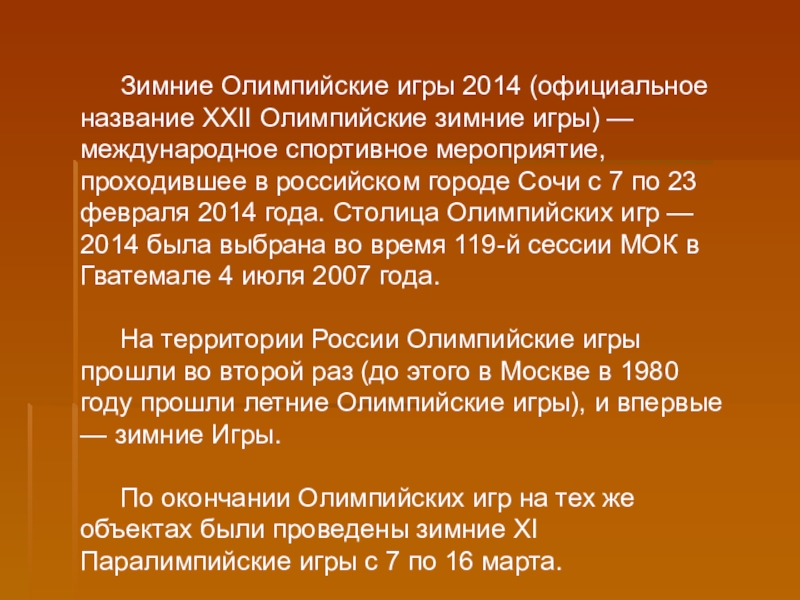 Слайд 17Зимние Олимпийские игры 2014 (официальное название XXII Олимпийские зимние игры) —
