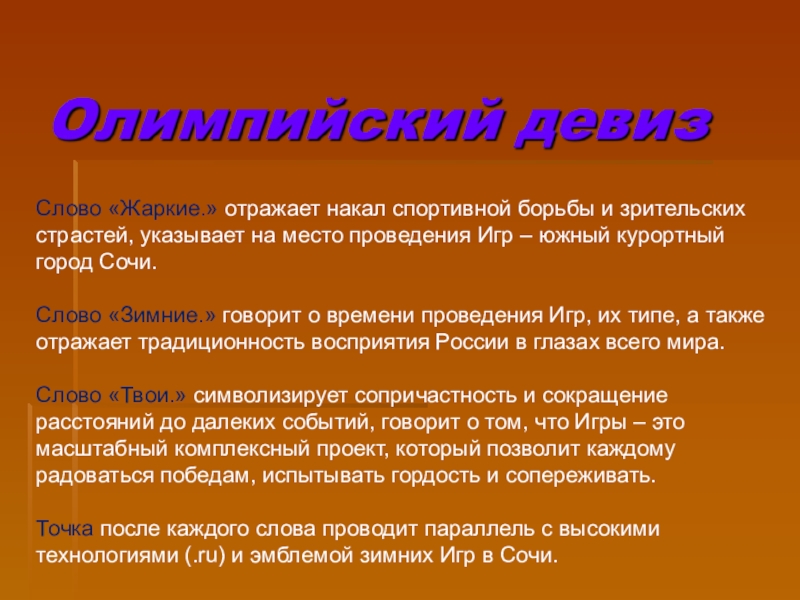 Точка после каждого слова проводит параллель с высокими технологиями (.ru) и эмблемой зимних Игр в Сочи.