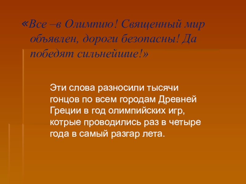 Слайд 9«Все –в Олимпию! Священный мир объявлен, дороги безопасны! Да победят сильнейшие!»
