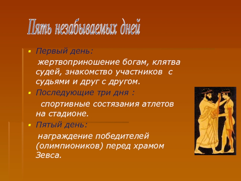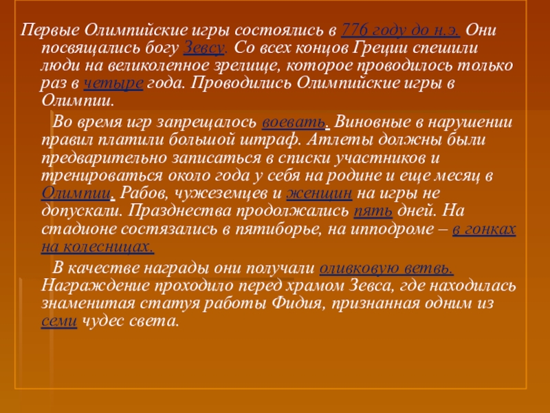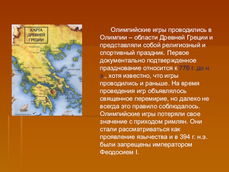 собой религиозный и спортивный праздник. Первое документально подтвержденное празднование относится к 776 г. до н.э., хотя известно, что игры проводились и раньше. На время проведения игр объявлялось священное перемирие, но далеко не всегда это правило соблюдалось. Олимпийские игры потеряли свое значение с приходом римлян. Они стали рассматриваться как проявление язычества и в 394 г. н.э. были запрещены императором Феодосием I.