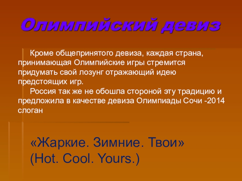 Россия так же не обошла стороной эту традицию и предложила в качестве девиза Олимпиады Сочи -2014 слоган
