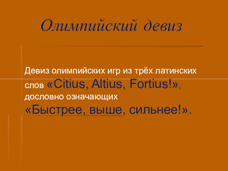 Девиз олимпийских игр из трёх латинских слов «Citius, Altius,