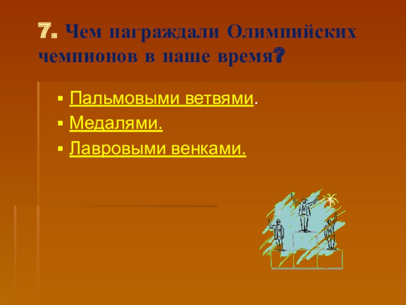 Слайд 357. Чем награждали Олимпийских чемпионов в наше время?